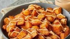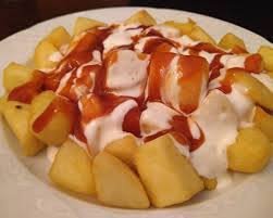 Patatas bravas fritas con barbacoa, bacon y queso al horno